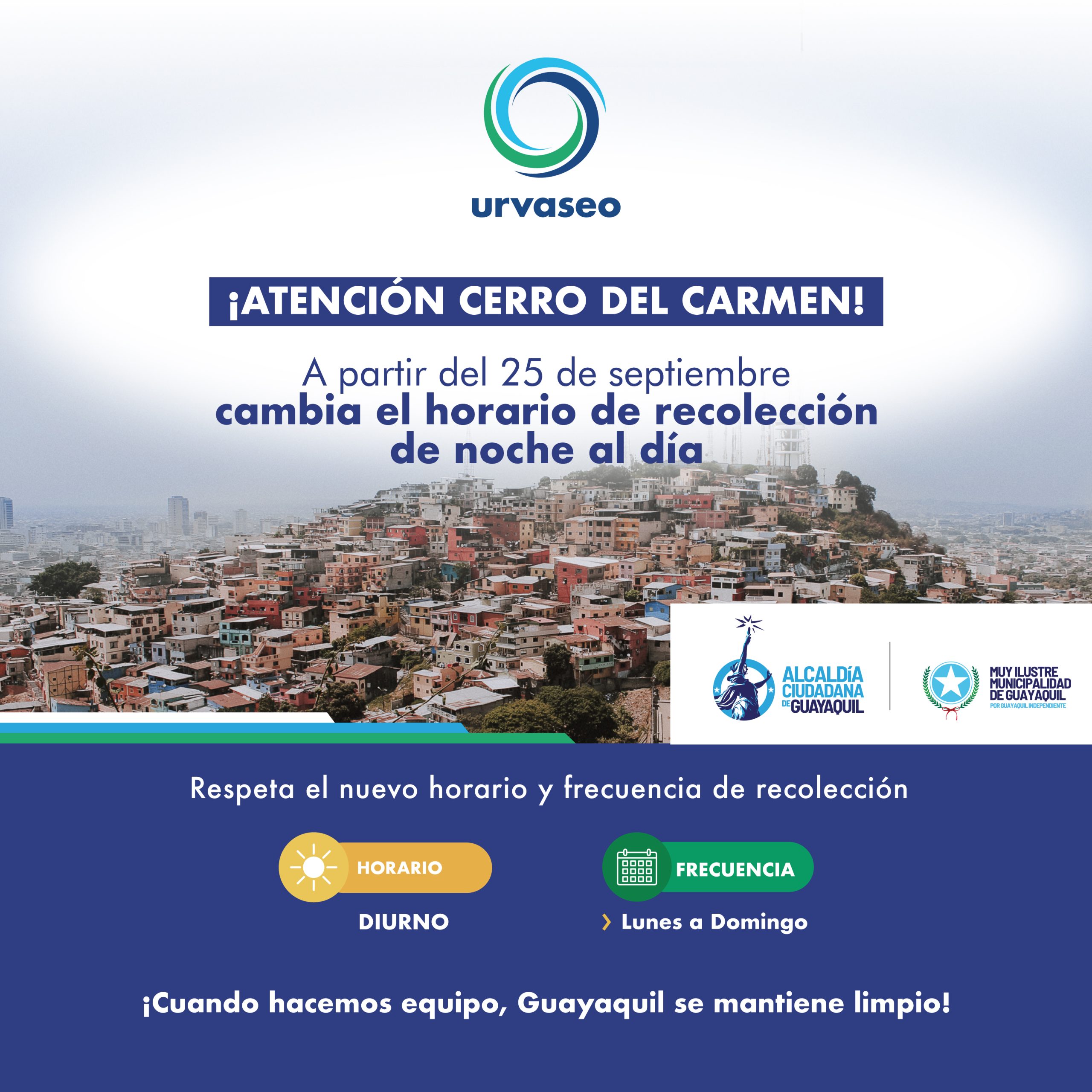 Campaña informativa en calles Tulcán y Pedro Pablo Gómezagosto 25, 2023¡Atención moradores del Cerro del Carmen! 👇septiembre 8, 2023 Instagram will load in the frontend. Otros Post abril 20, 2026Ustedes qué opinan ¿pasan o no pasan la lección los vecinos 😎?Ver másabril 20, 2026Vecinos de Alborada etapa 2. Recomendamos disponer sus desechos en la Av. Agustín Freire Icaza 🚛 debido al cierre temporal de la Av. Rodolfo Baquerizo Nazur.Ver másabril 15, 2026⚠️ Vecinos, del mirador de Balerio Estacio, recuerden disponer sus desechos en la vía principal del sector “Las Cañitas”.Ver más